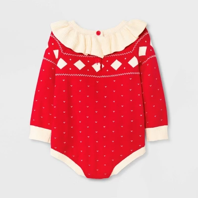 Update your baby’s cool-weather wardrobe with this Fair Isle Sweater Romper from Cat & Jack™. This bright red sweater romper features sweet frills along the round neckline and cream-colored Fair Isle patterning. Made from knitted cotton fabric, this long-sleeve romper keeps them in warm, breathable comfort. The ribbed cuffs provide a snug fit, while the crotch snaps and back buttons make dressing and diaper changing a breeze.