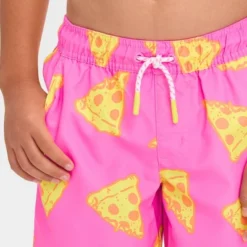 They’ll love gearing up for the beach or the pool wearing these Pizza Printed Swim Shorts from Cat & Jack™. These lightweight swim trunks are designed with a built-in brief for comfort and extra coverage both in and out of the water. Featuring a yellow pizza slice print on a bright pink backdrop, these mid-rise swim trunks are fun to pair with a variety of rash guards, tees or tanks for versatile swimwear options. The full elastic waistband with an adjustable drawstring lends them a secure and customizable fit. Plus, the UPF 50+ finish helps protect against UV rays.