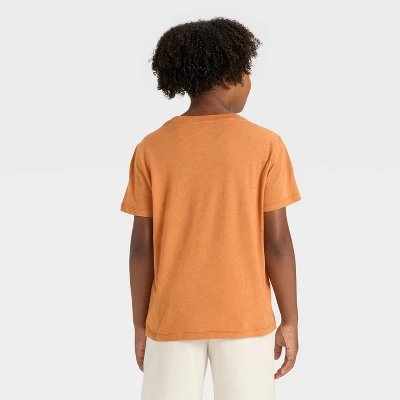 This Short-Sleeve Skeleton Rodeo Graphic T-Shirt from Cat & Jack™ is perfect for your young thrill seeker. Made from cotton-recycled polyester blend jersey fabric, this short-sleeve T-shirt brings cozy comfort to their day, while the below-waist length allows them to wear it tucked in or untucked. Designed in a brown hue, this crewneck tee features a graphic of a skeleton cowboy riding a dinosaur in a rodeo for whimsical flair.