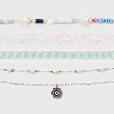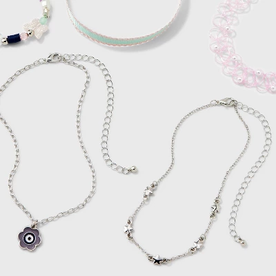 Add a splash of color to any outfit with this Girls’ 5pk Choker Necklace Set – Cat & Jack™. Crafted from a mix of polyester, zinc alloy, iron and acrylic, these necklaces offer a playful variety of styles and textures. The multi-colored design ensures a vibrant look, while the pull-on and lobster claw clasp closures provide easy wearability. Perfect for kids and teens, this set is a delightful accessory collection.