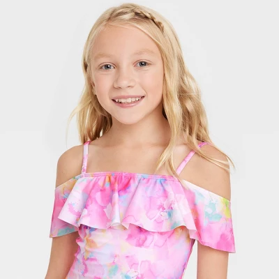 Give their swimwear a cool, comfy update with this Flower Daydream One-Piece Swimsuit from Cat & Jack™. Covered with a colorful abstract pattern, this one-piece swimsuit features ruffles along the neckline for a sweet, adorable look. Crafted from a soft and stretchy fabric, this one-piece swimsuit is designed with elastic at the leg openings to keep them comfortable both in and out of water, while extra protection from UV rays is offered by the UPF 50+ rating fabric.