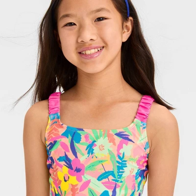 Help your kid dress up in an amazing look with the “Shore Garden” Floral Printed Midkini Set from Cat & Jack™. This two-piece midkini set includes a sleeveless swim top with floral print and cut-out detailing along the neckline, as well as a solid-color swim bottom for a coordinated look. The bottom is designed with pull-on style and elastic at leg openings. Tailored from soft and stretchy fabric, this pink midkini set offers four-way stretch for comfort and sun protection with the UPF 50+ rated fabric.